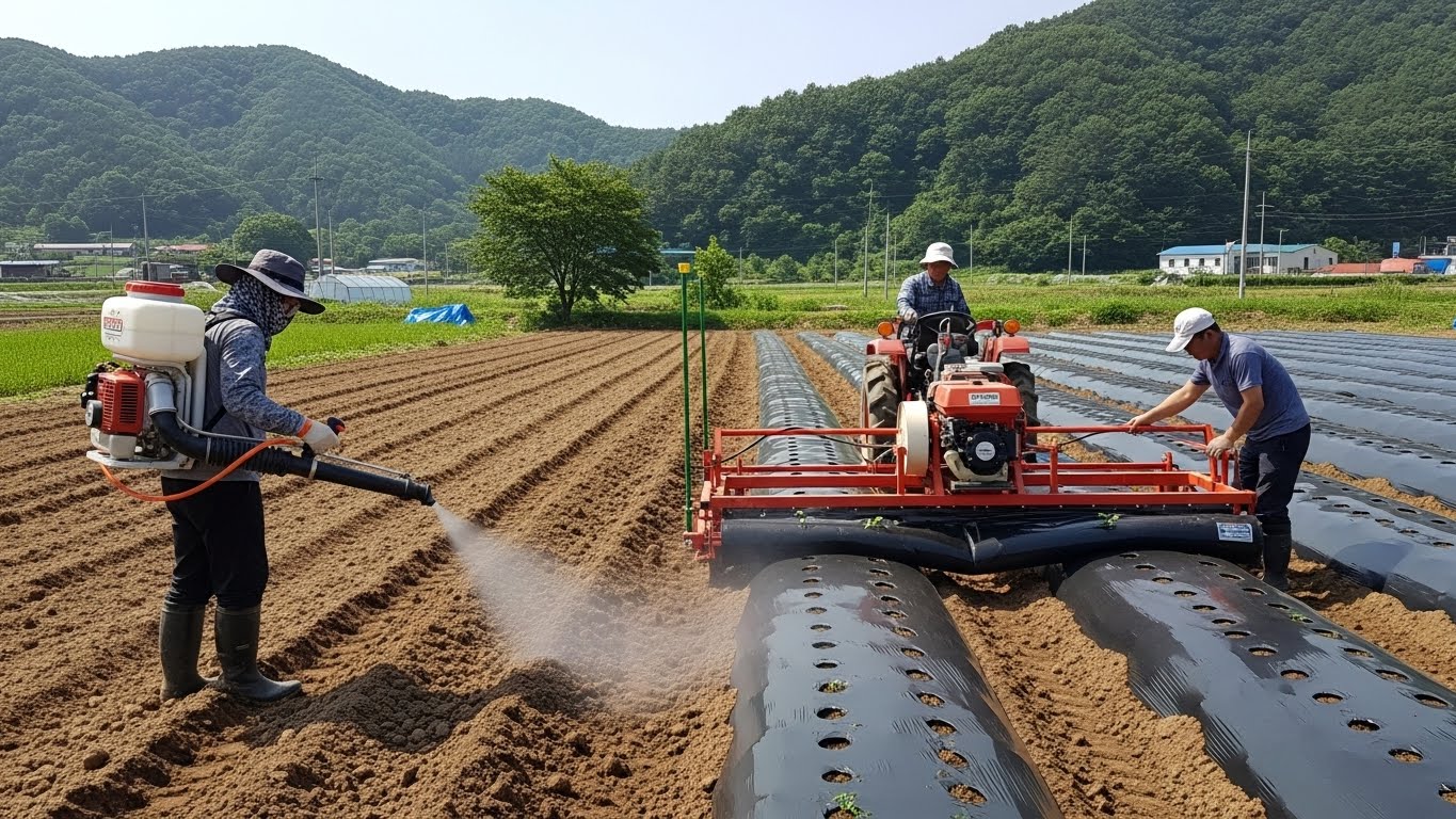 배추 토양소독제 살포 및 멀칭 작업 모습