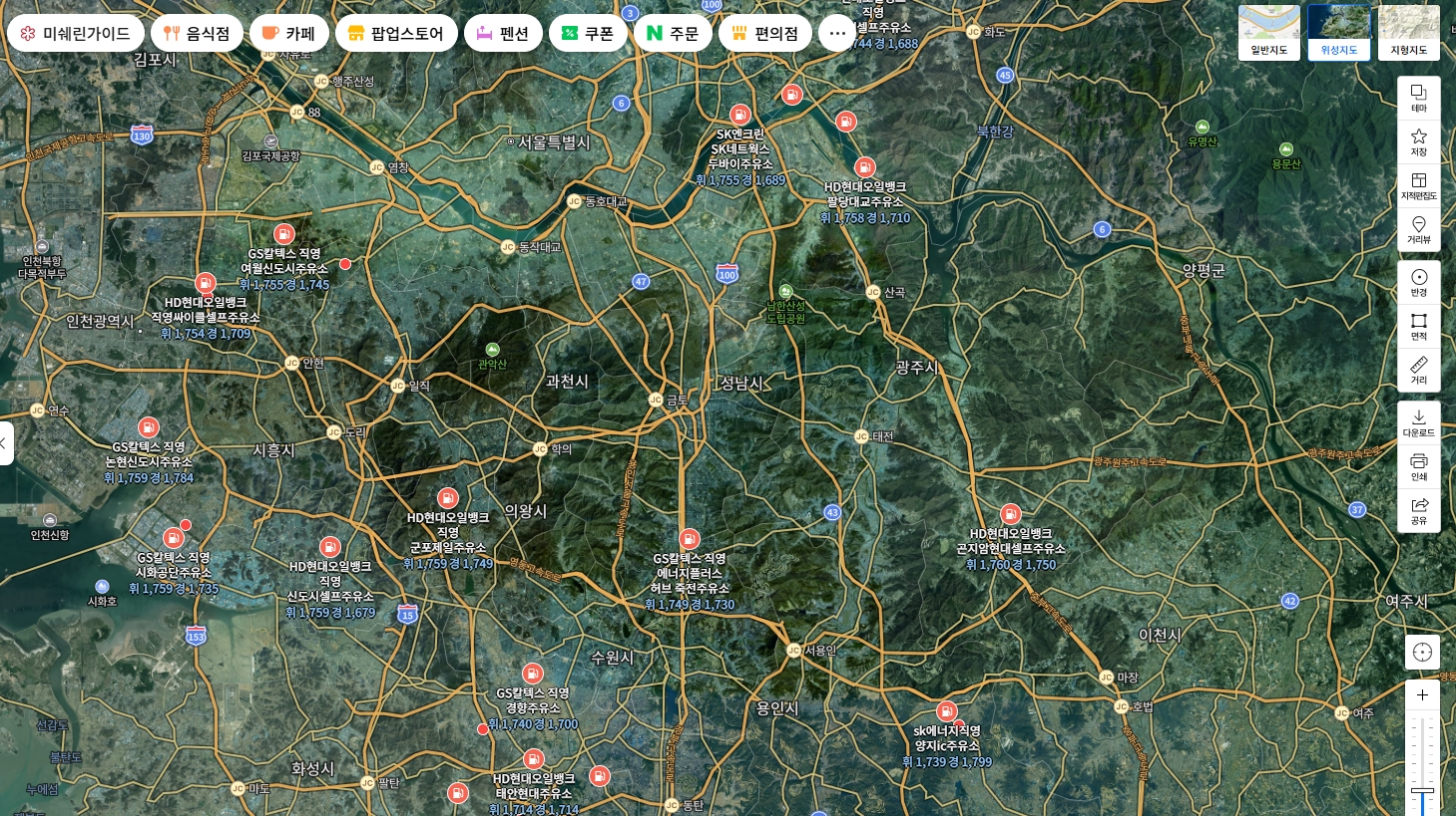 동네별로 최저가 주유소가 어떻게 다른지 한눈에 볼 수 있는 지도 화면