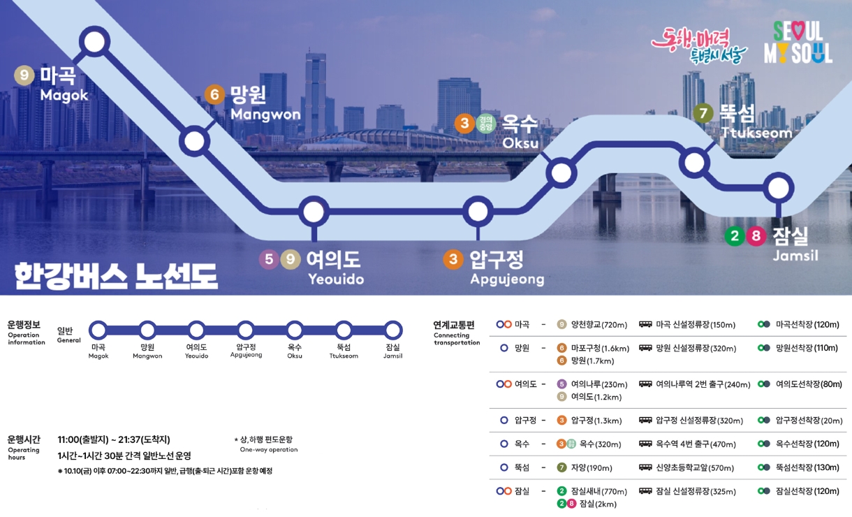 - 주요 코스: 여의도, 강남, 잠실, 반포 등 한강 주변 핵심 지역 연결